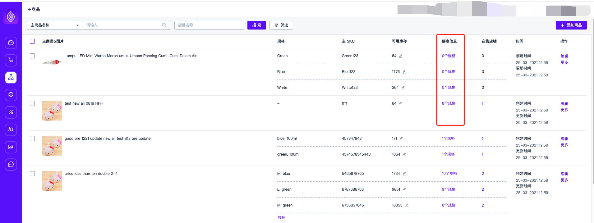 导航到主商品列表-找到要添加绑定的主SKU–点击绑定信息,提示该主SKU的绑定信息弹窗。