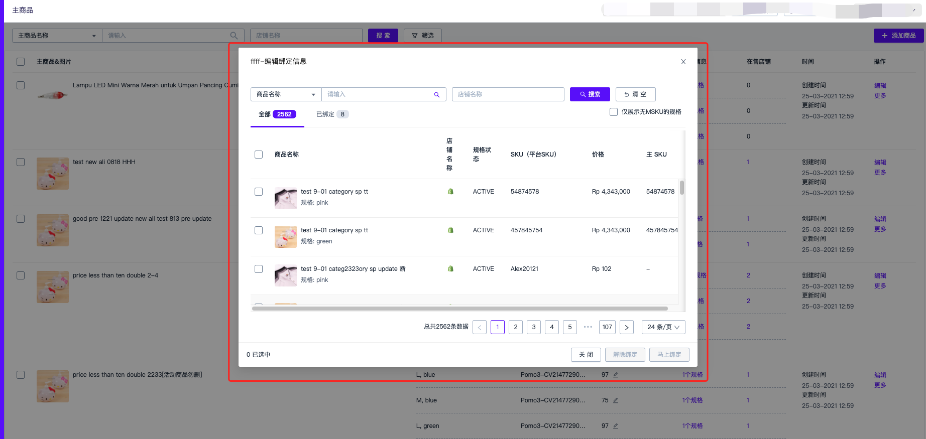 导航到主商品列表-按SKU或主SKU找到操作解绑的主商品-主SKU–点击绑定信息,提示该主SKU的绑定信息弹窗。