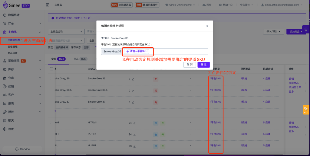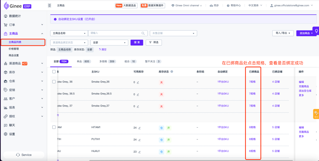 在【主商品列表】,点击自动绑定,进入编辑页面——增加需要绑定的渠道SKU,绑定完成后在已绑商品处点击规格,查看渠道SKU与主SKU是否绑定成功。