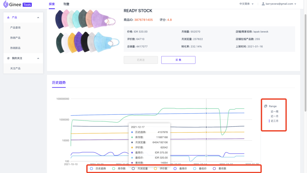 选择到想要的商品后,点击右侧【详情】即可进入商品详情页。在这里您可以得到关于此产品的具体数据信息及历史趋势折线图,如月销量、上架时间、转换率、评价数、库存、最高价最低价等,同时还可以进行时间范围的筛选,同时也可以加到关注列表进行数据的持续追踪,同时也可以点击【采集】,将商品一键采集到采集列表中