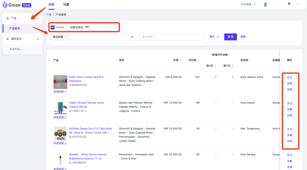 选择到想要的商品后,点击右侧【详情】即可进入商品详情页(目前Lazada平台仅支持查看商品的评价数、发货地等信息)同时还可以进行时间范围的筛选,同时也可以加到关注列表进行数据的持续追踪,同时也可以点击【采集】,将商品一键采集到采集列表中