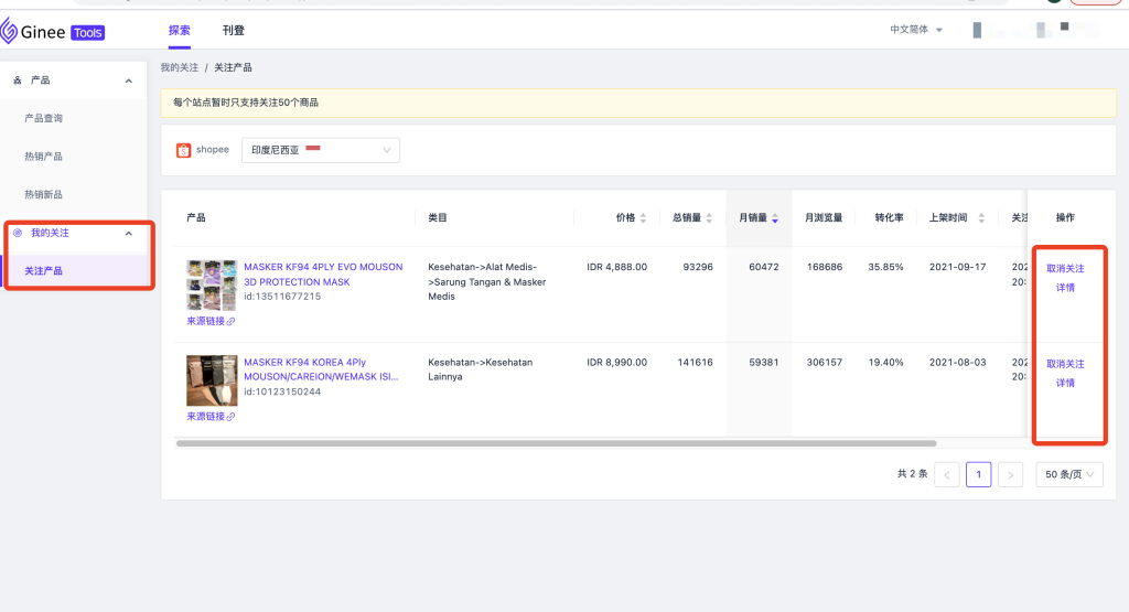3.我的关注:将您想关注的产品/竞品商品信息关注后,来到【我的关注】-【关注产品】列表,随时监控你的竞品动态信息(目前每个站点暂时只支持添加50个关注商品)
