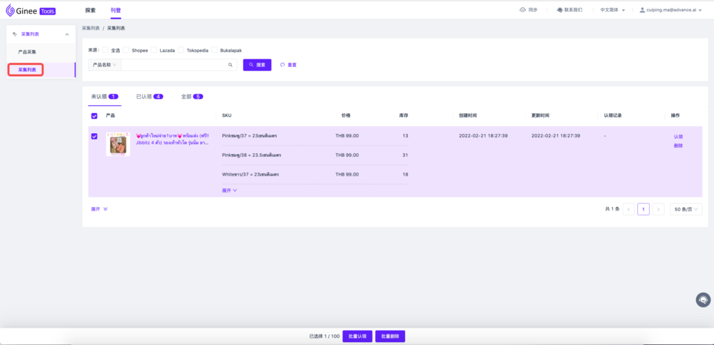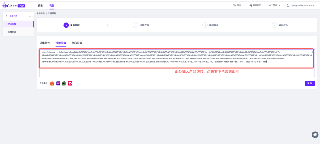 注意:Ginee tools 支持链接采集和插件采集,此处建议您使用插件采集,功能更稳定更快速! 1.链接采集可以采集单个产品也可以采集多个产品;