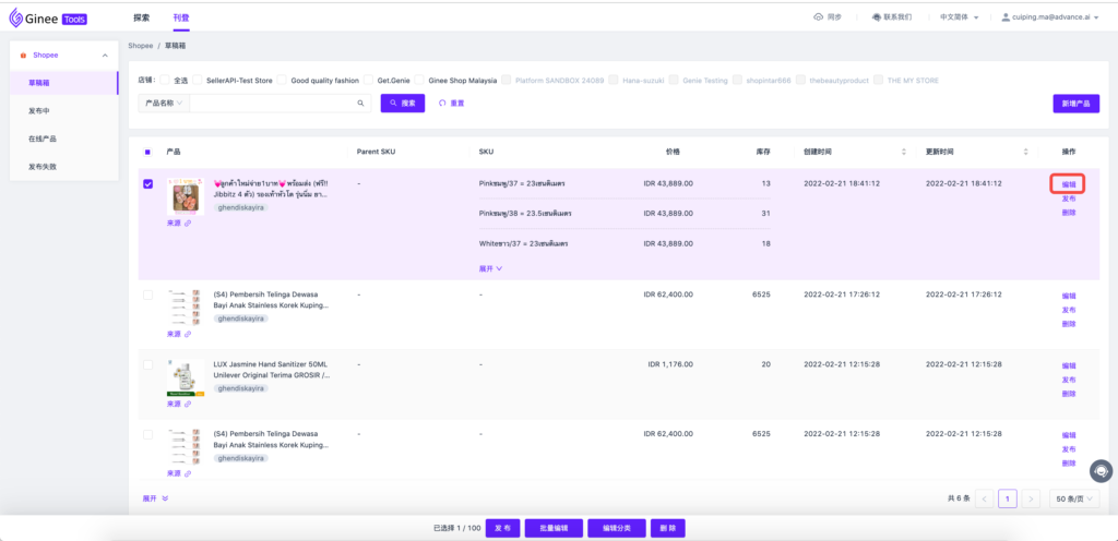 注意:1)ginee tools 支持新增,发布,编辑,删除,同步产品; 2)支持草稿箱,在线产品,发布失败批量编辑价格库存包裹尺寸; 3)支持草稿箱批量修改分类; 4)支持在线产品单个/批量上下架,批量编辑包裹尺寸,价格,库存,批量同步,批量删除。