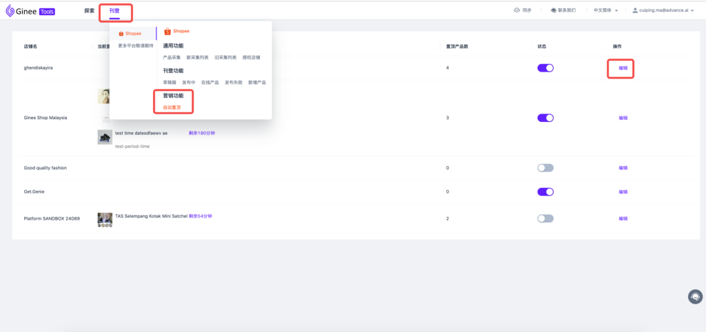 五、如何在ginee tools使用shopee自动置顶功能?