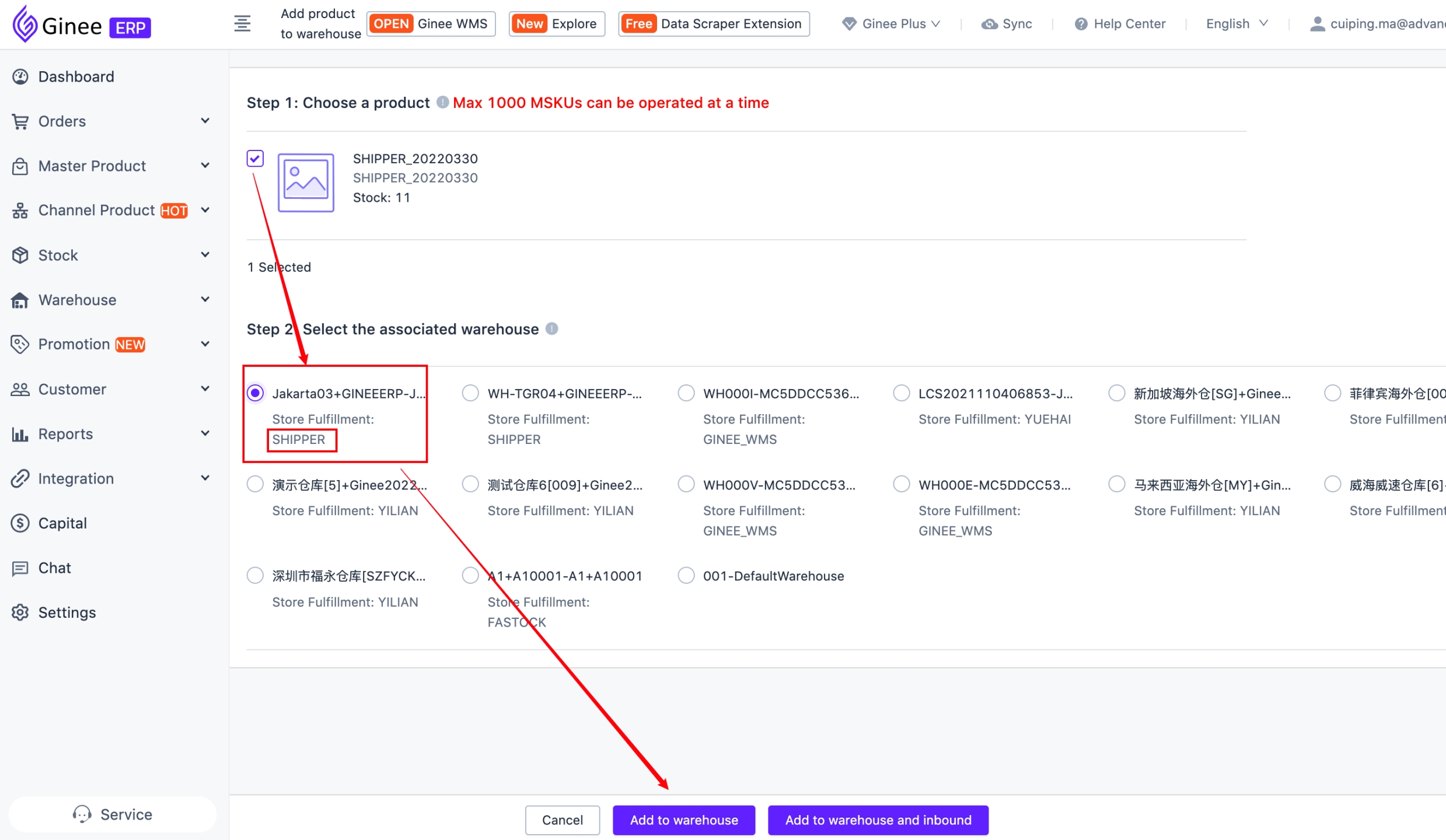 需要使用Shipper履约仓时,请务必与您的 Ginee 专属客服确认您的账户已有开通主商品及仓库管理权限或自行在系统内通过是否存在“商品–>主商品”及“仓库管理”的菜单进行确认