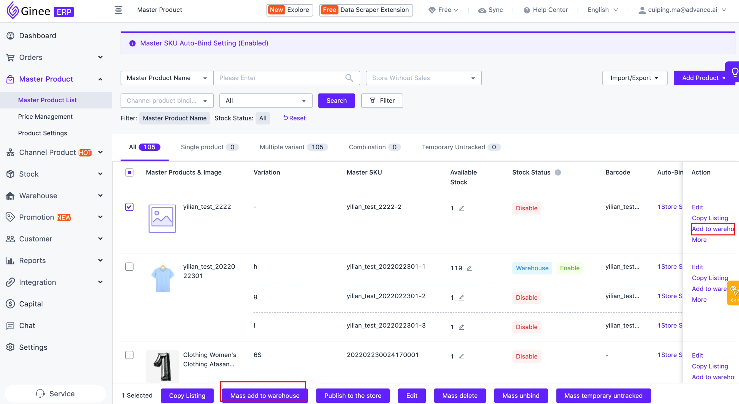 在主商品管理页面,选择已有的商品,选择添加到Shipper仓库,即可将商品申请放置到Shipper仓库进行管理