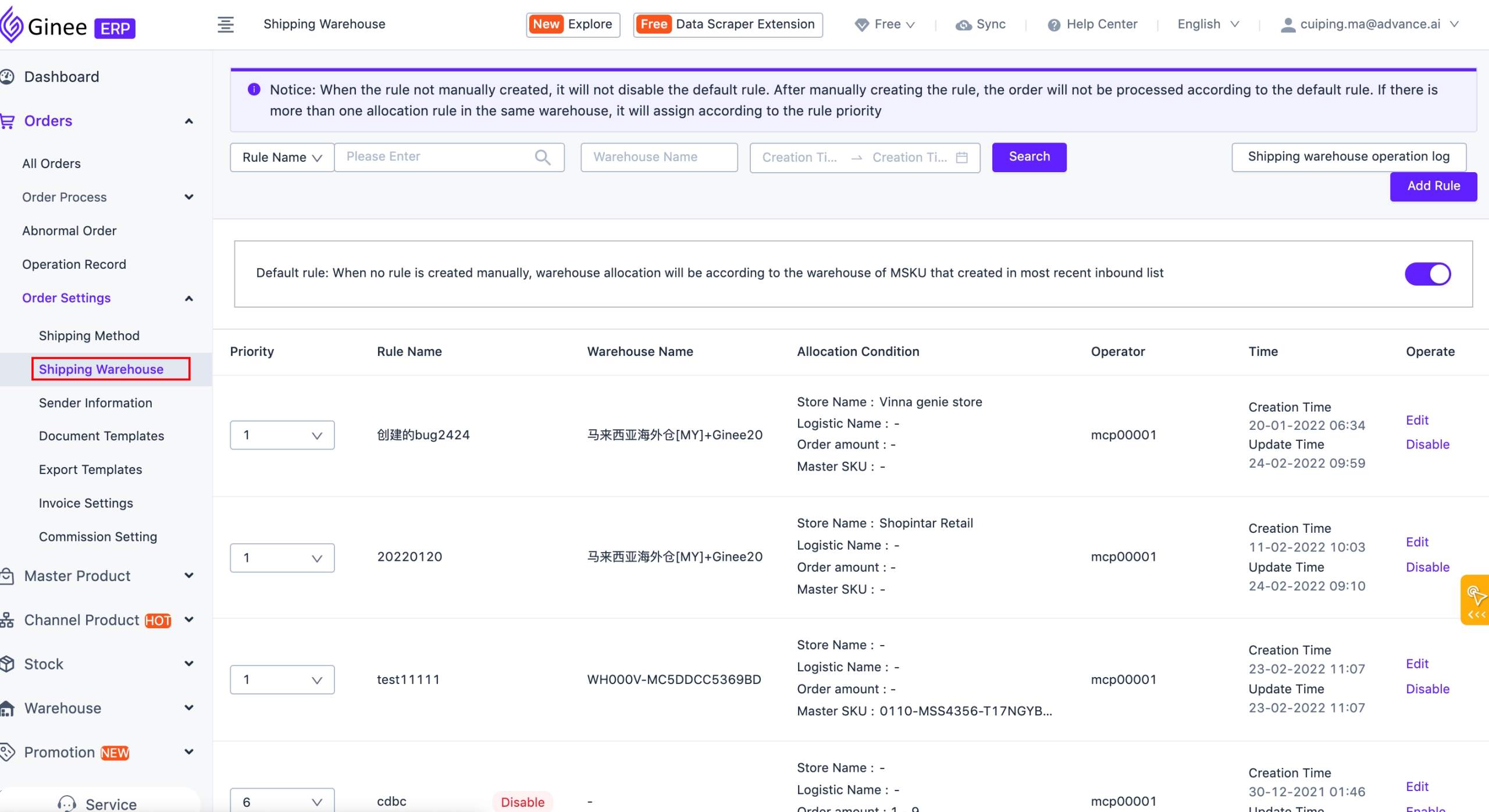 先在分仓规则中配置好对应的规则: