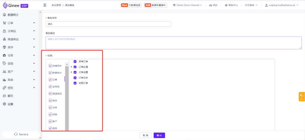 勾选相对应的店铺,选择角色,代表即可使用配置好的店铺权限,其他店铺及权限无法查看使用。”已有权限“可详细查看到选择角色的权限内容。