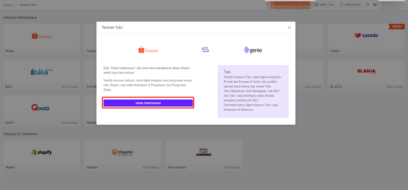 选择您要绑定的渠道,当前Ginee支持Shopee,Tokopedia,Bukalapak,JD.ID,Shopify,不久将支持更多渠道。